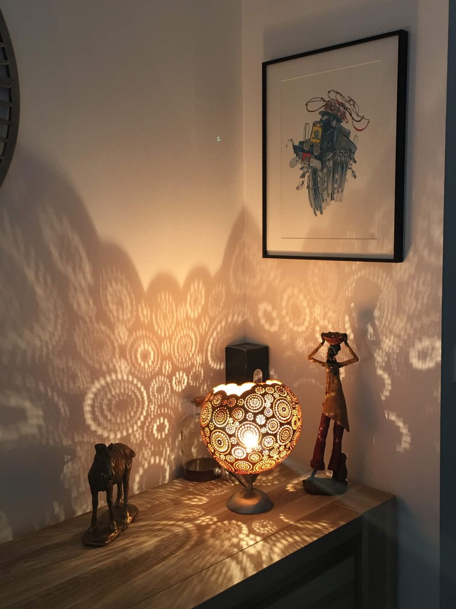 Kunsthandwerker seit 25 Jahren, spezialisiert auf die Herstellung von Design- und Kunstleuchten aus Kalebassenholz. Die Lampen erzeugen eine heitere Atmosphäre, die durch die Projektionen auf die Wände zum Träumen und Entspannen anregt