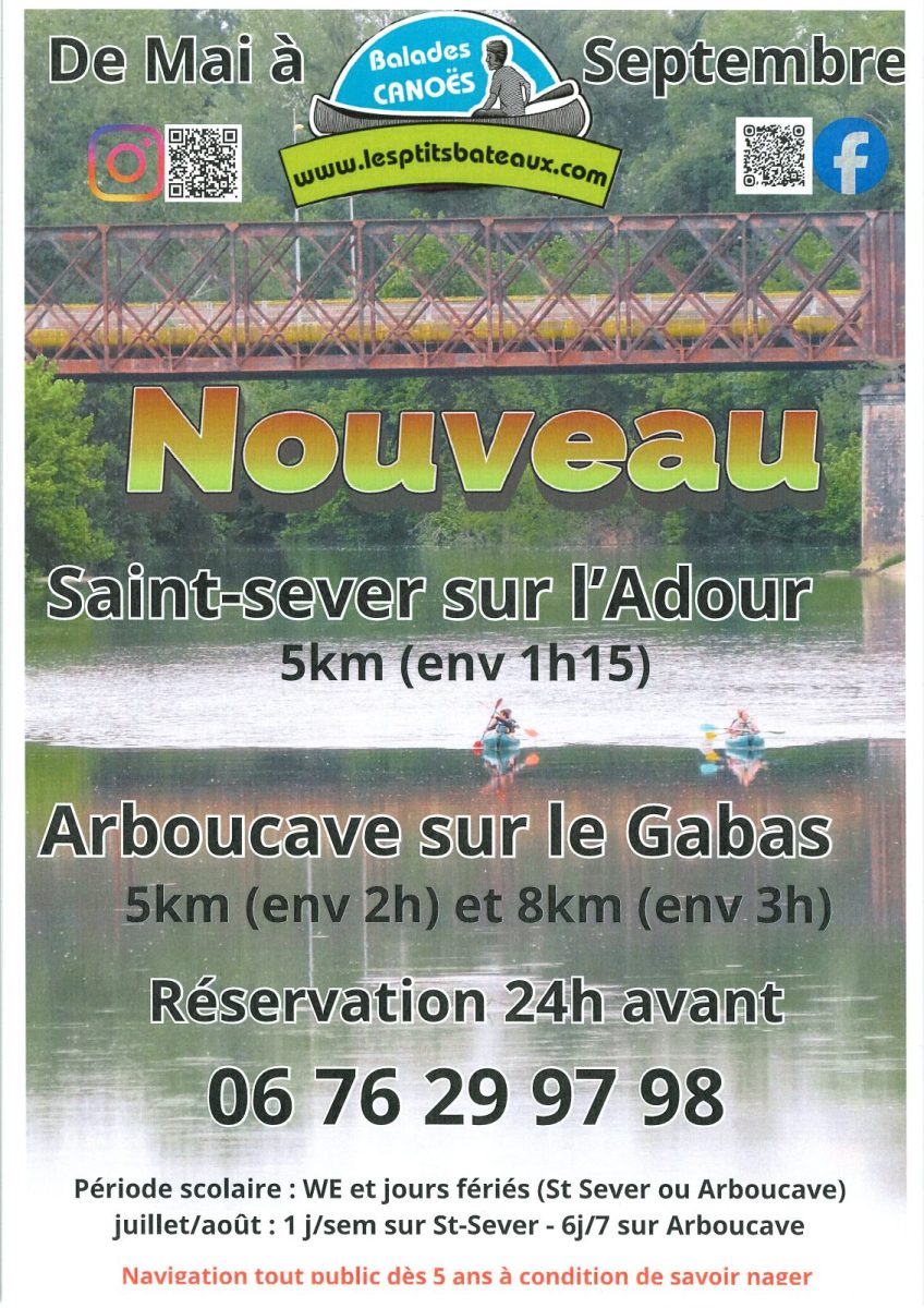 Tursan einmal anders... Mit dem Kanu auf dem Gabas, einem schönen, unauffälligen Fluss, spazieren zu gehen, ist nun möglich. Die einfache Navigation ermöglicht es allen, Groß und Klein, sich in einer grünen Umgebung zu entspannen. Es werden mehrere Strecken mit der Möglichkeit eines Picknicks angeboten, um die Ruhe der Umgebung zu genießen.