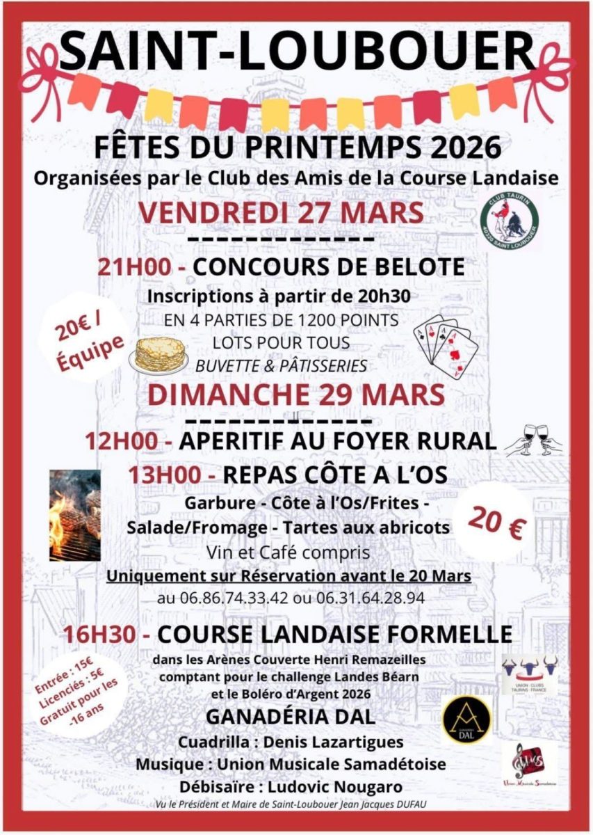 12H00 - APERITIF AU FOYER RURAL 13H00 - REPAS CÔTE A L'OS Garbure - Côte à 10?/ Pommes Frites-Salat/Käse - Poire Belle Hélène Wein und Kaffee inbegriffen Nur auf Reservierung