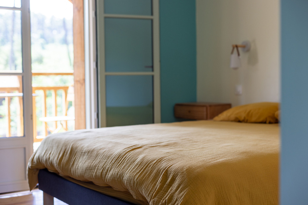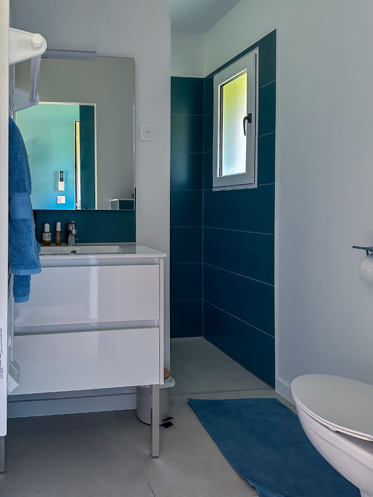 Im Obergeschoss gelangt man über eine Außentreppe zu den 4 Schlafzimmern: Jedes Zimmer verfügt über ein eigenes Bad, eine Toilette sowie eine Terrasse mit Tisch und Stühlen. Ausgestattet mit: Baumwollbettwäsche, Handtüchern, Toilettenpapier, Wattestäbchen, Duschgel und Shampoo, Föhn.