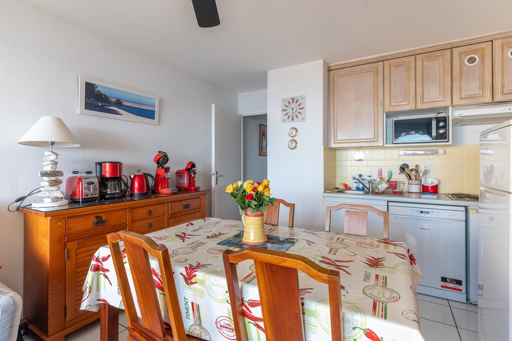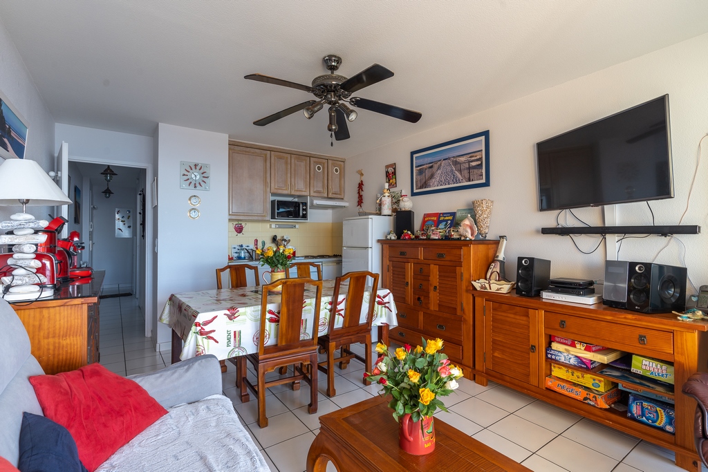 Die 35 m² große Wohnung liegt im 2. Stock und verfügt über einen Wohnraum mit Terrasse zum Meer, eine Küchenzeile (Mikrowelle, Dunstabzug, 4 Elektroplatten, 2 Kühlschränke, Geschirrspüler), ein Duschbad mit WC sowie ein Schlafzimmer. Dank der Westlage können Sie den Sonnenuntergang vom Balkon (7 m2, mit elektrischem Vordach) aus beobachten. Unmittelbarer Zugang zu den endlosen, feinen Sandstränden und der Fußgängerzone, dem pulsierenden Zentrum des Badeorts.