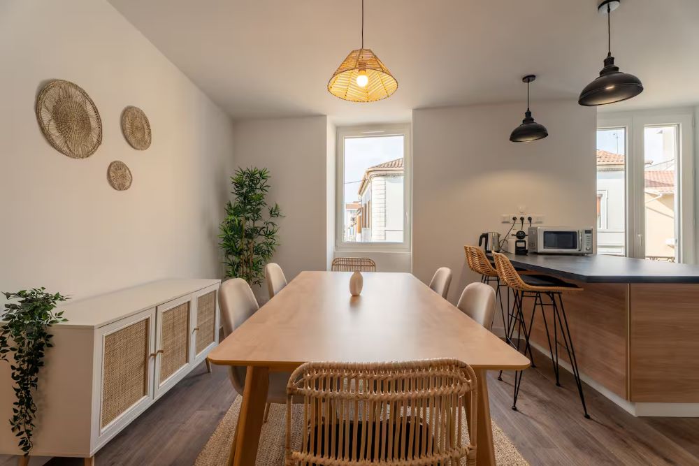 Der große Wohnraum vereint eine voll ausgestattete Küche, in der Sie Ihre Mahlzeiten ganz einfach zubereiten können, einen gemütlichen Essbereich und ein warmes Wohnzimmer mit TV-Ecke, das sich perfekt zum Entspannen oder für einen Moment zu zweit eignet. Das Ambiente ist weich und gepflegt und lädt zu einem angenehmen Aufenthalt ein.