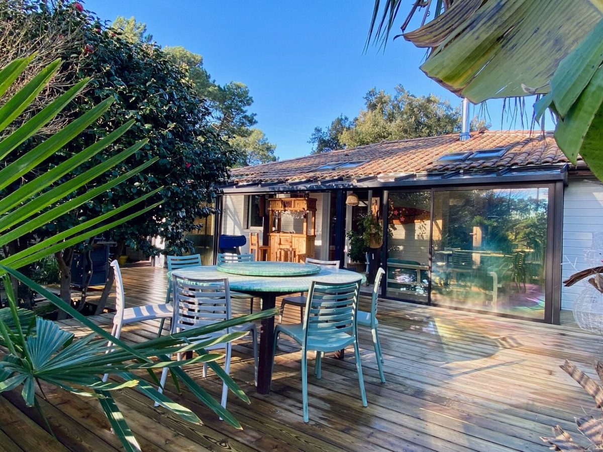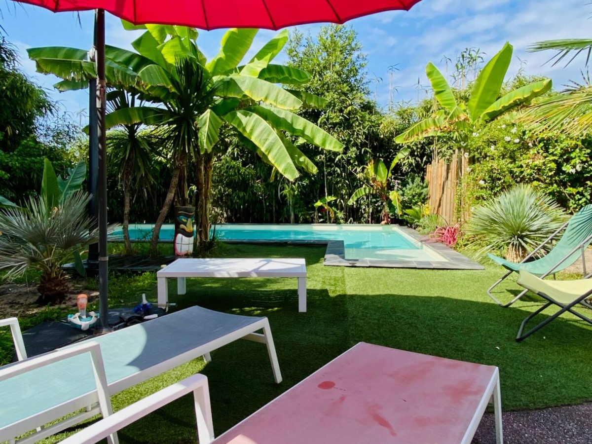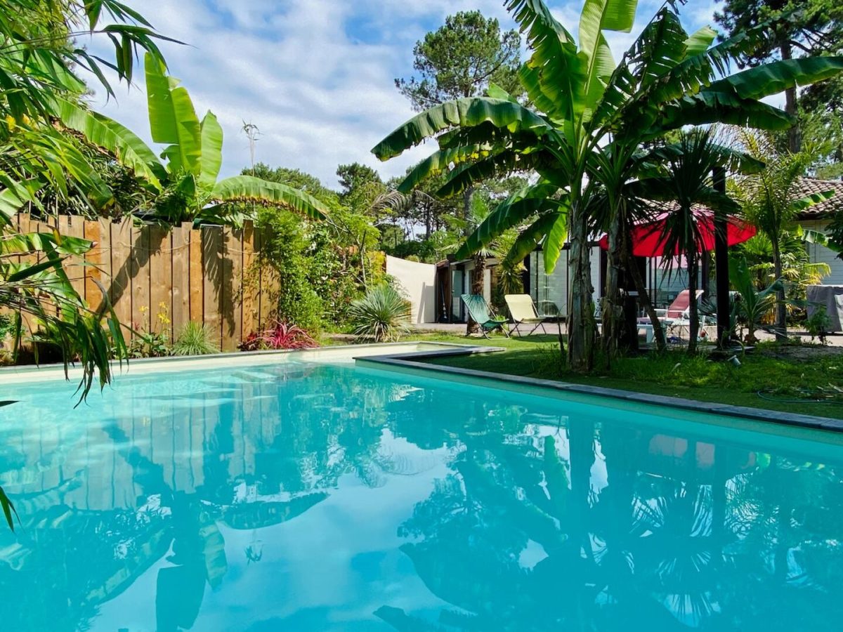 Landaise Villa mit Klimaanlage, komplett renoviert mit beheiztem Pool 8x4 mit Strand, umgeben von einem exotischen Garten mit Bäumen.