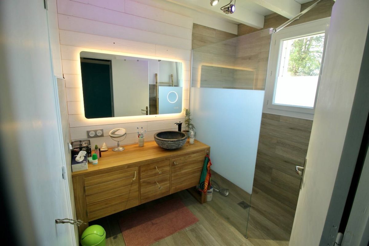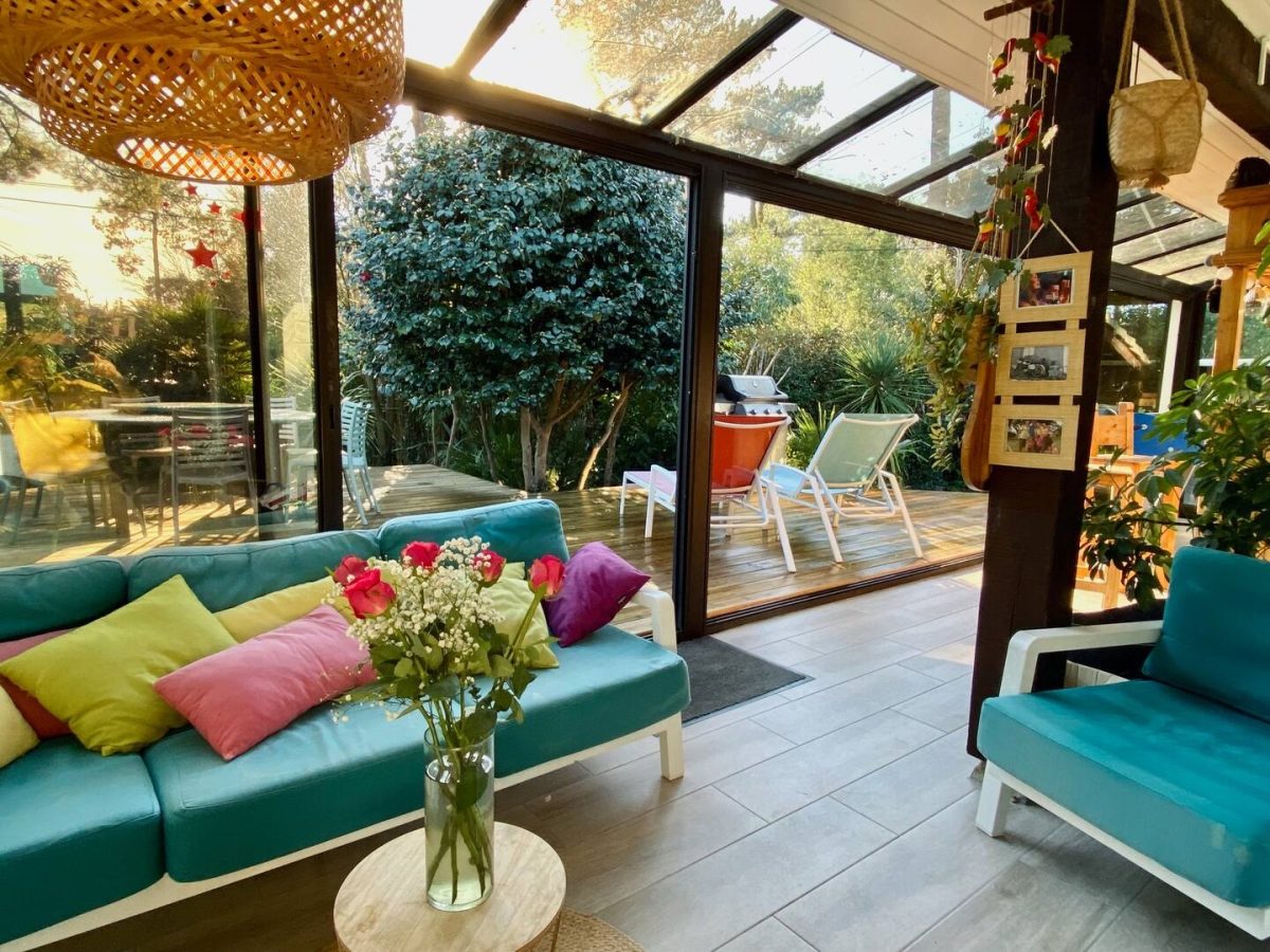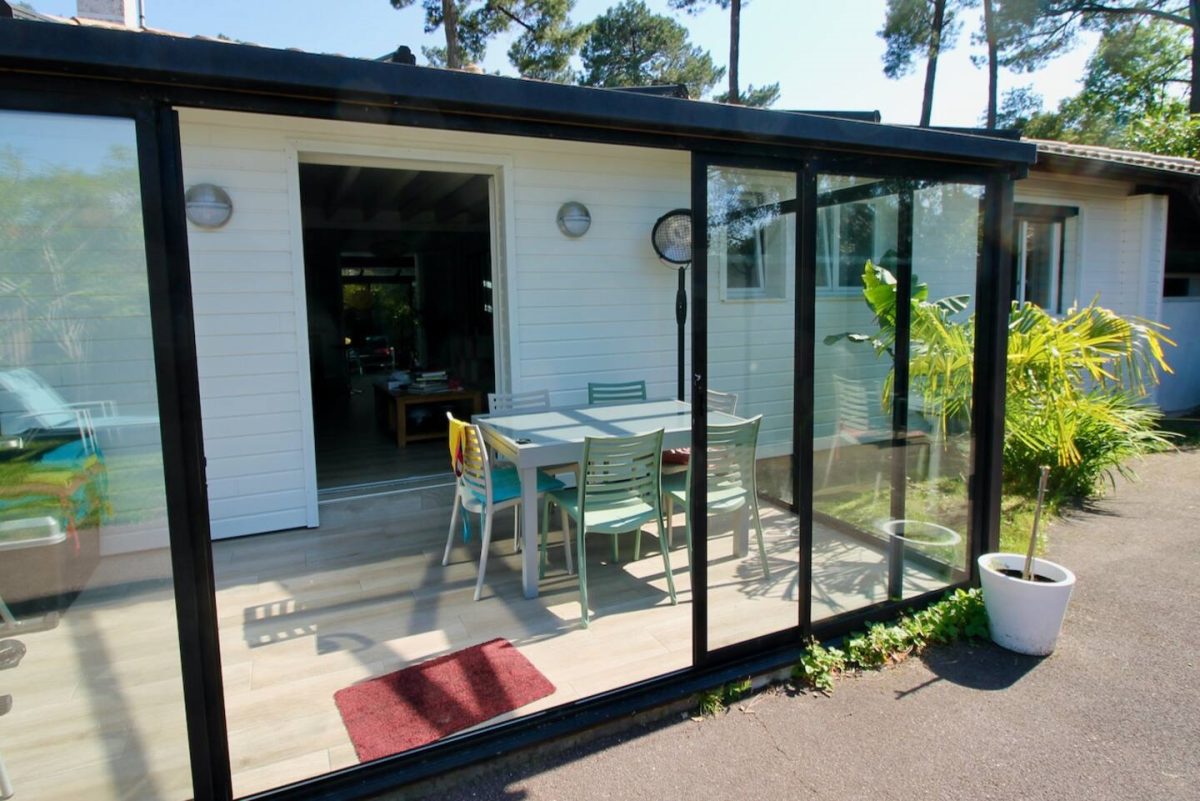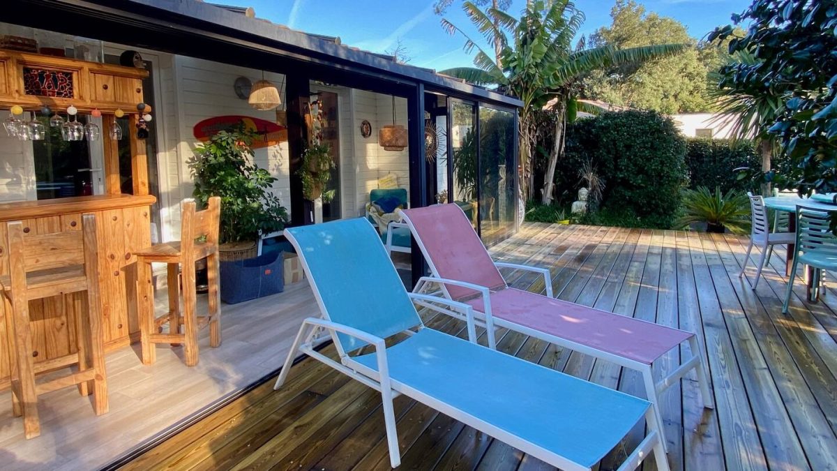 Landaise Villa mit Klimaanlage, komplett renoviert mit beheiztem Pool 8x4 mit Strand, umgeben von einem exotischen Garten mit Bäumen.