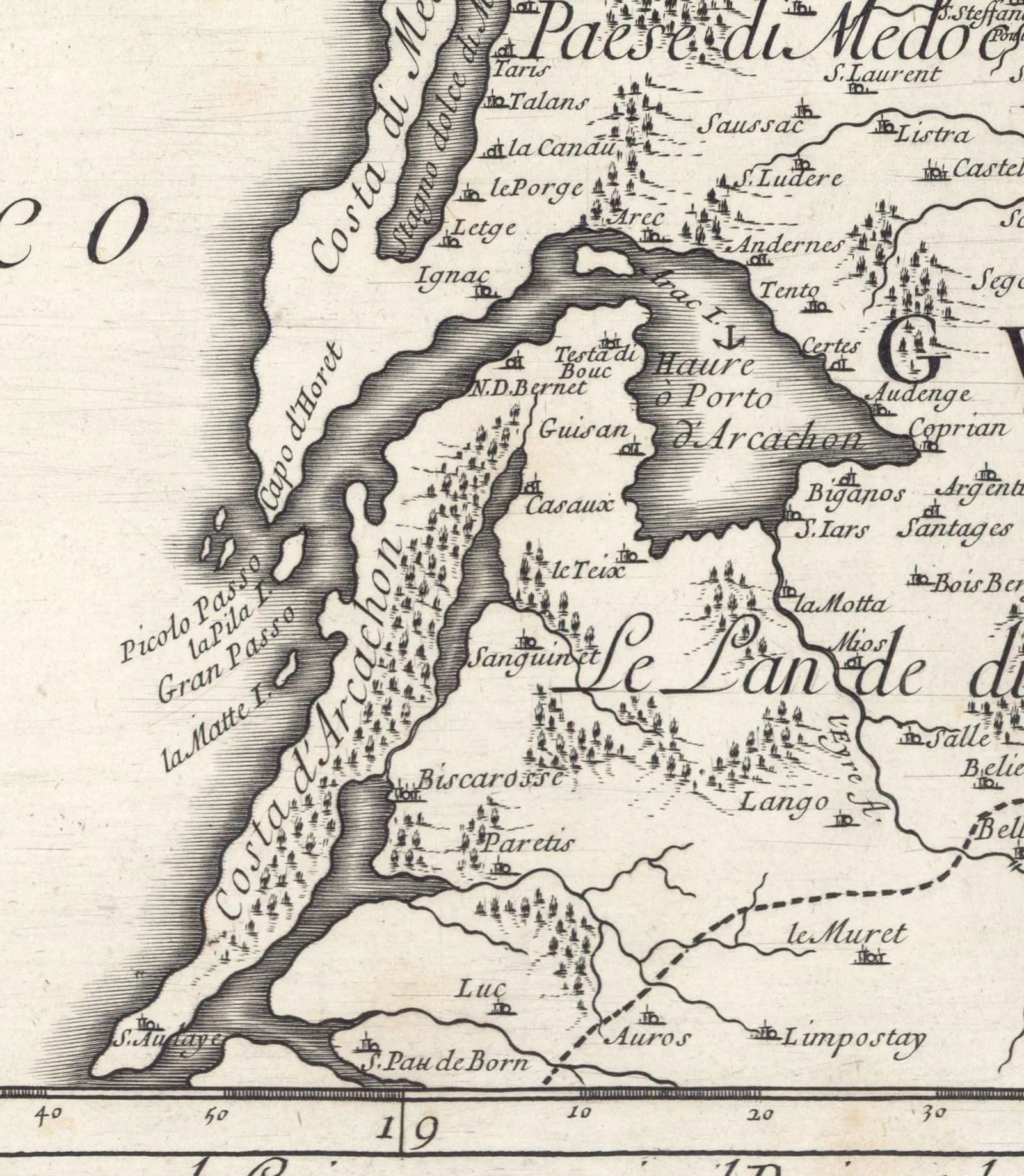 La carte “della Guienna e della Guascona”’ (de la Guyenne et de la Gascogne), dressée par le géographe italien Giacomo CANTELLI DA VIGNOLA en 1695, nous laisse à voir un trait de côte alors bien tourmenté.