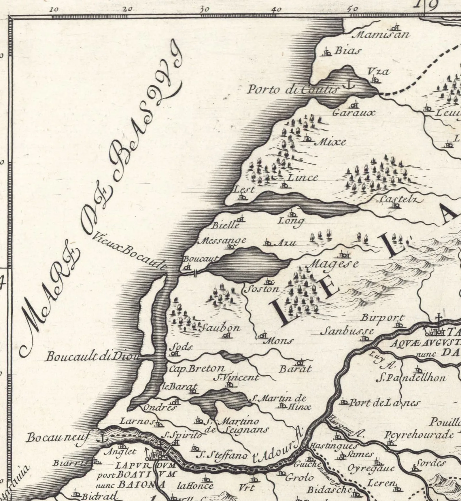 A la lecture de cette carte, vous ne serez pas étonnés d’apprendre que l’étymologie du terme « Marensin » (Pays historique qui s’étend de Contis à Soustons) viendrait du latin Maris sinus, golfe de la mer.