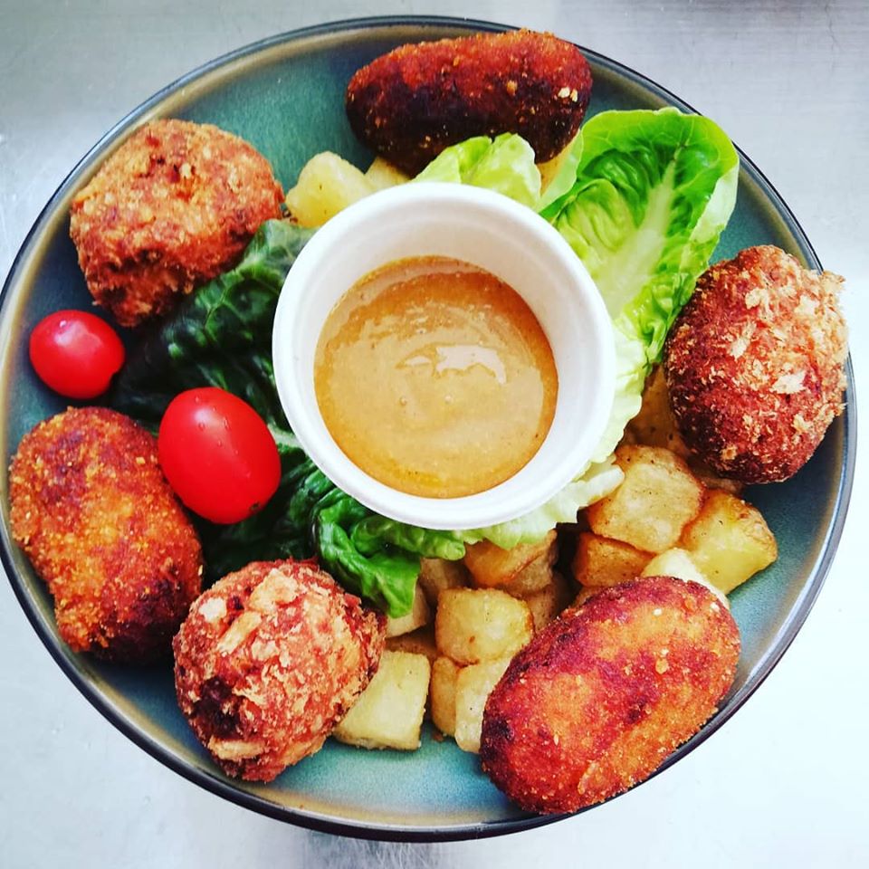 Hausgemachte Küche im Snackstil rund um das Hähnchen, aber auch um Spezialitäten, die von einigen kulinarischen Reisen inspiriert wurden: marinierte Unterschenkel und Wings, goldbraune Nuggets, Fleischbällchen und Croquetas, Pita mit hausgemachter Guacamole, vegane Bratlinge und andere vegetarische Rezepte, dreierlei Empanadas ... Mais, Patatas oder Salat, ergänzt durch DIE geheime Hey-Poulette-Sauce, um die Geschmacksknospen zu wecken.
