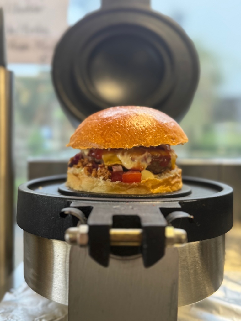 Unser Signature Burger, der UFO Burger, überrascht durch sein originelles Format und seinen Geschmack. Er wird mit einem weichen, handwerklich hergestellten Brot und lokalem Fleisch zubereitet.