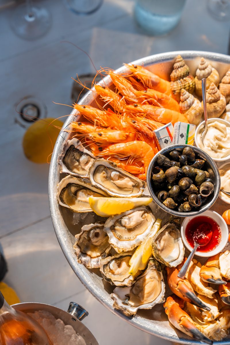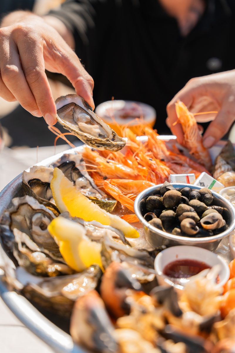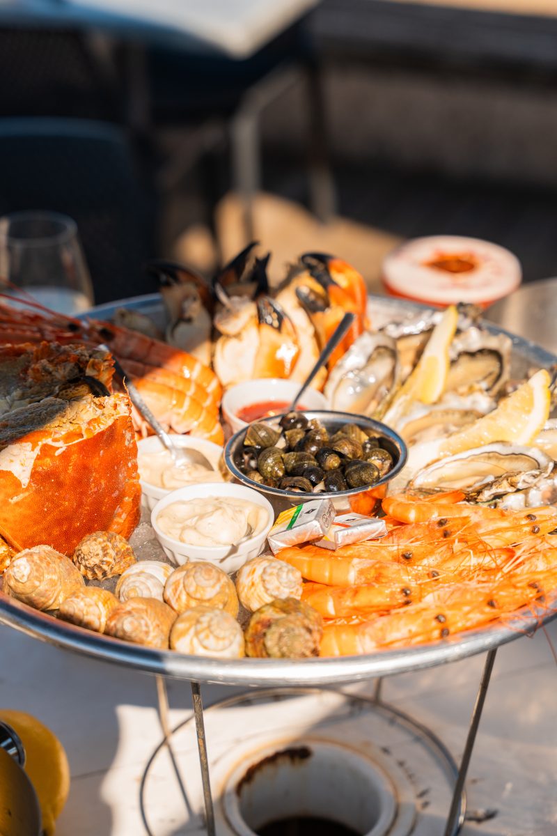 Meeresfrüchteplatte nach Wunsch zusammengestellt, zum Verzehr vor Ort oder zum Mitnehmen Köstliche Menüs mit Austern aus dem Becken von Arcachon.