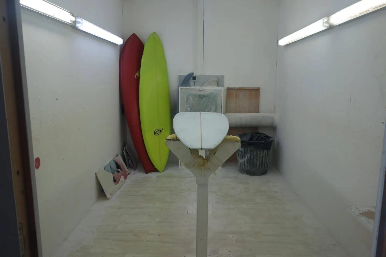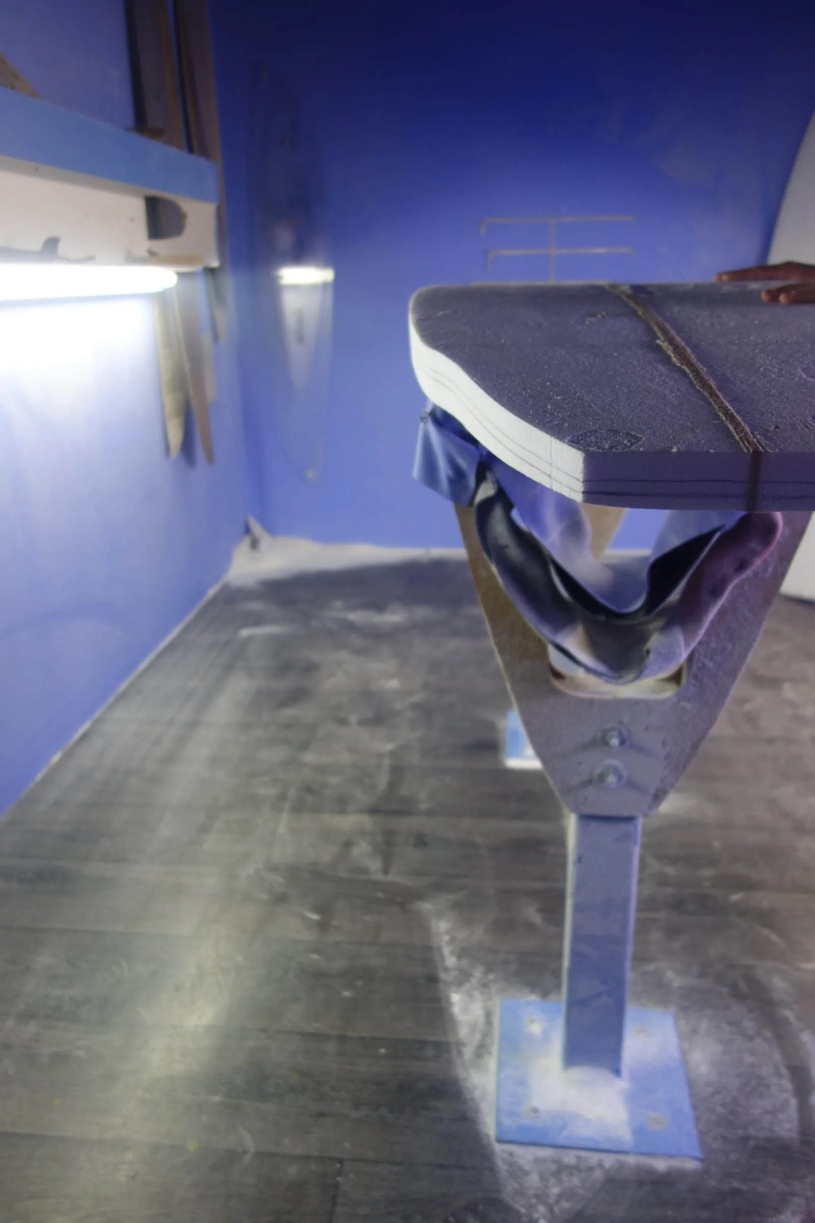 « cette salle est blanche et éclairée par des néons blancs en hauteur pour que l’on puisse voir le brillant du glassage à poncer».