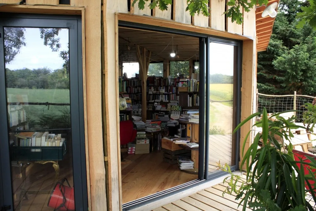 Après avoir tenu des librairies à Hossegor et Capbreton, Michel et Olga ont perché leur librairie d’occasions dans les chênes de Saubion, village landais retiré au calme mais facilement repérable sur les cartes. Ils proposent à la vente des bouquins d’occasions ainsi qu’une papeterie fantaisie (petit cahier de voyage, petit cahier de cave, etc…). Michel et Olga se qualifient de bouquinistes. Ce sont plus de 7000 livres qui sont en place sur les chouettes étagères de la chouette cabane car tout est chouette ici comme le dit Olga. Des chouettes livres, un chouette lieu et un chouette chien qui déambule librement dans les lieux : Isis, la maîtresse des lieux. La cabane accueille des conteurs en résidence en partenariat avec la CC MACS. Les artistes viennent tester leur spectacle devant le public présent.
