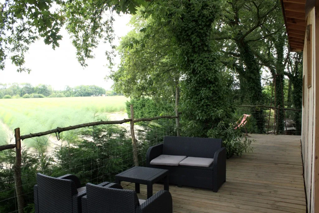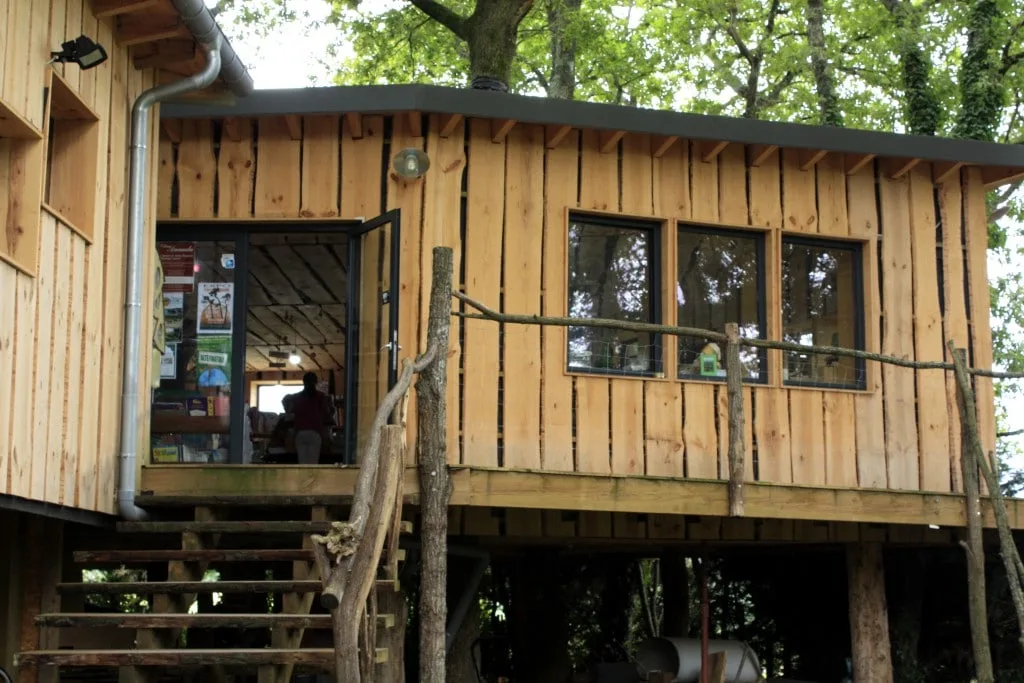 C’est un sacré pari que Michel et Olga ont accompli. Michel a dessiné les plans de la cabane, validé par un architecte. La cabane fait 160 m2 avec des terrasses suspendues extérieures. Les planches sont en pin maritime des Landes et ont été taillées dans une scierie locale. Michel a assuré la totalité de l’assemblage de la structure. La cabane repose sur pilotis composés de troncs de chênes tombés pendant la tempête Klaus de 2009. 3 chênes traversent la cabane pour donner un charme supplémentaire au lieu.